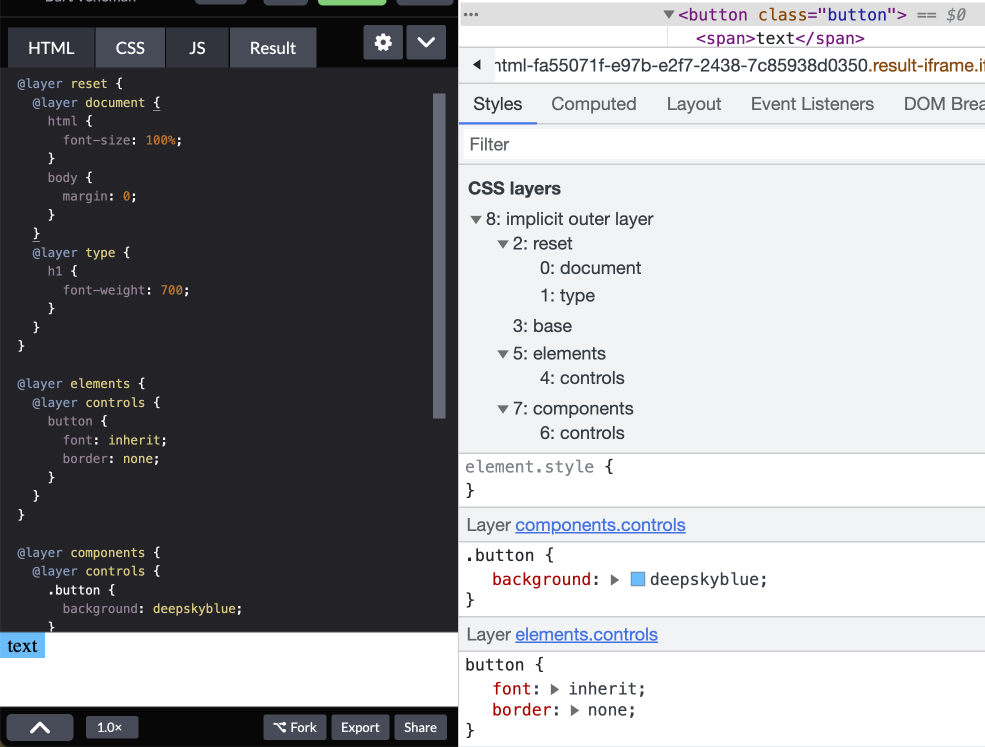 Layers can be nested, it’s even a very nice method to group certain parts of the CSS, like a sort of namespace. But, like CSS Nesting, it brings with it some difficulties in inspecting the final CSS. A declaration can be nested several layers deep, so to debug why certain properties are applied we need some sort of view of the resolved layer tree. Luckily, both Firefox and Chrome devtools are already on the case, but with different levels of completeness.