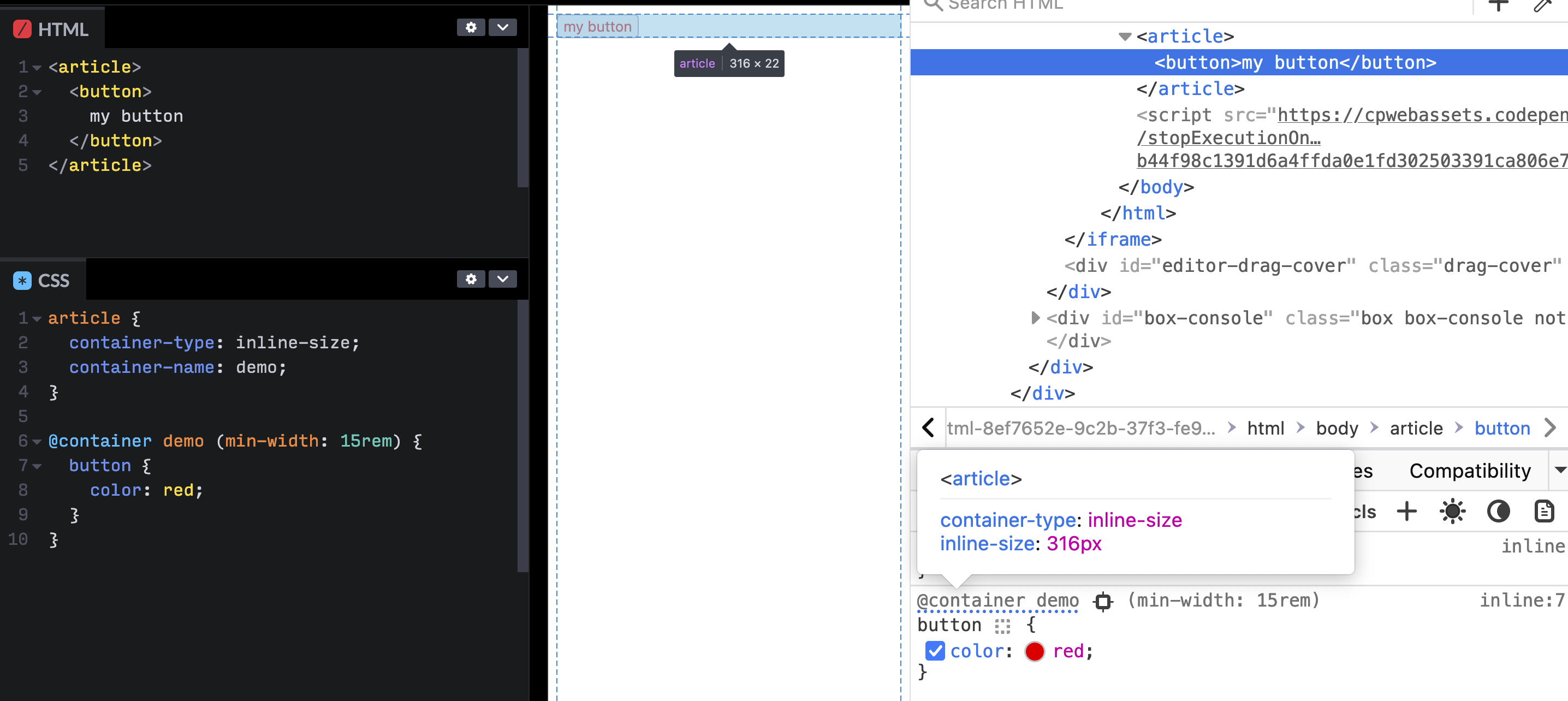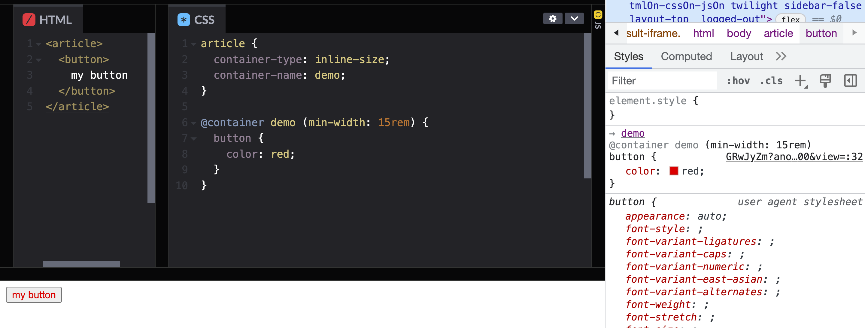 container-name, container-type and size query.It looks like Firefox is very much on top of the game here, although Chrome’s devtools are perfectly usable as well.